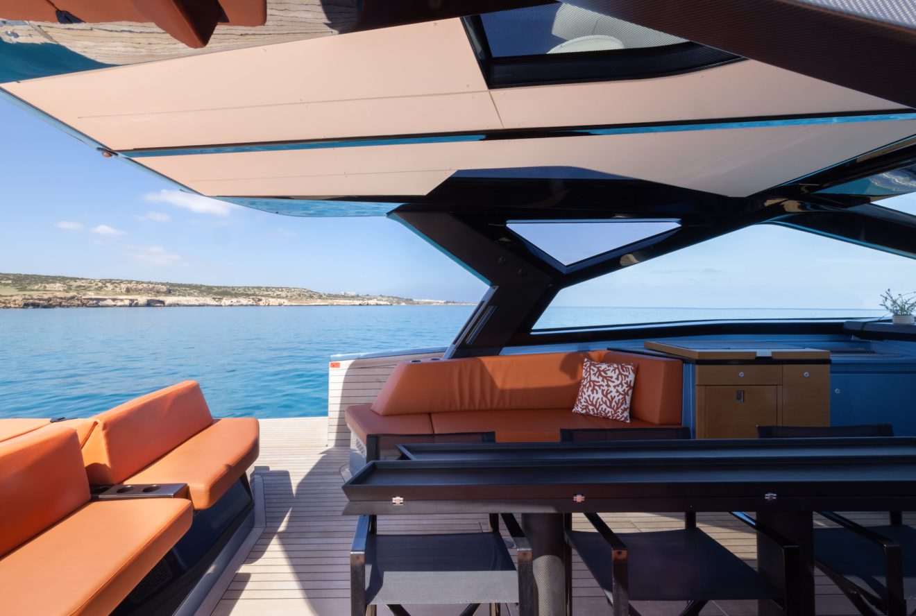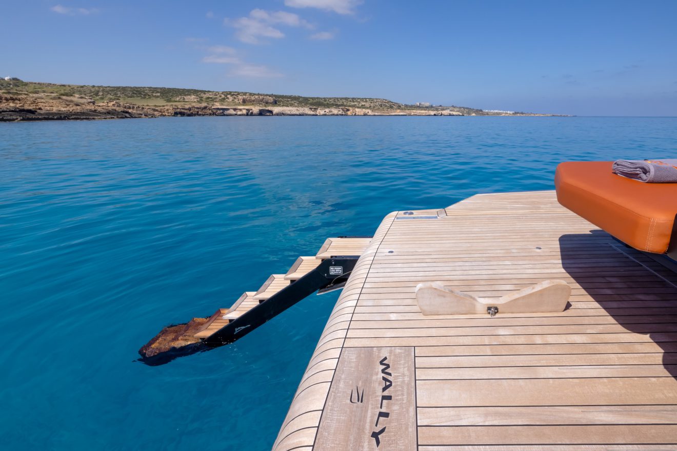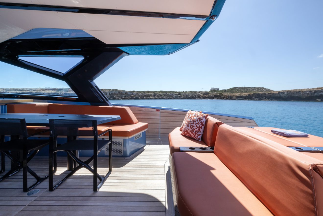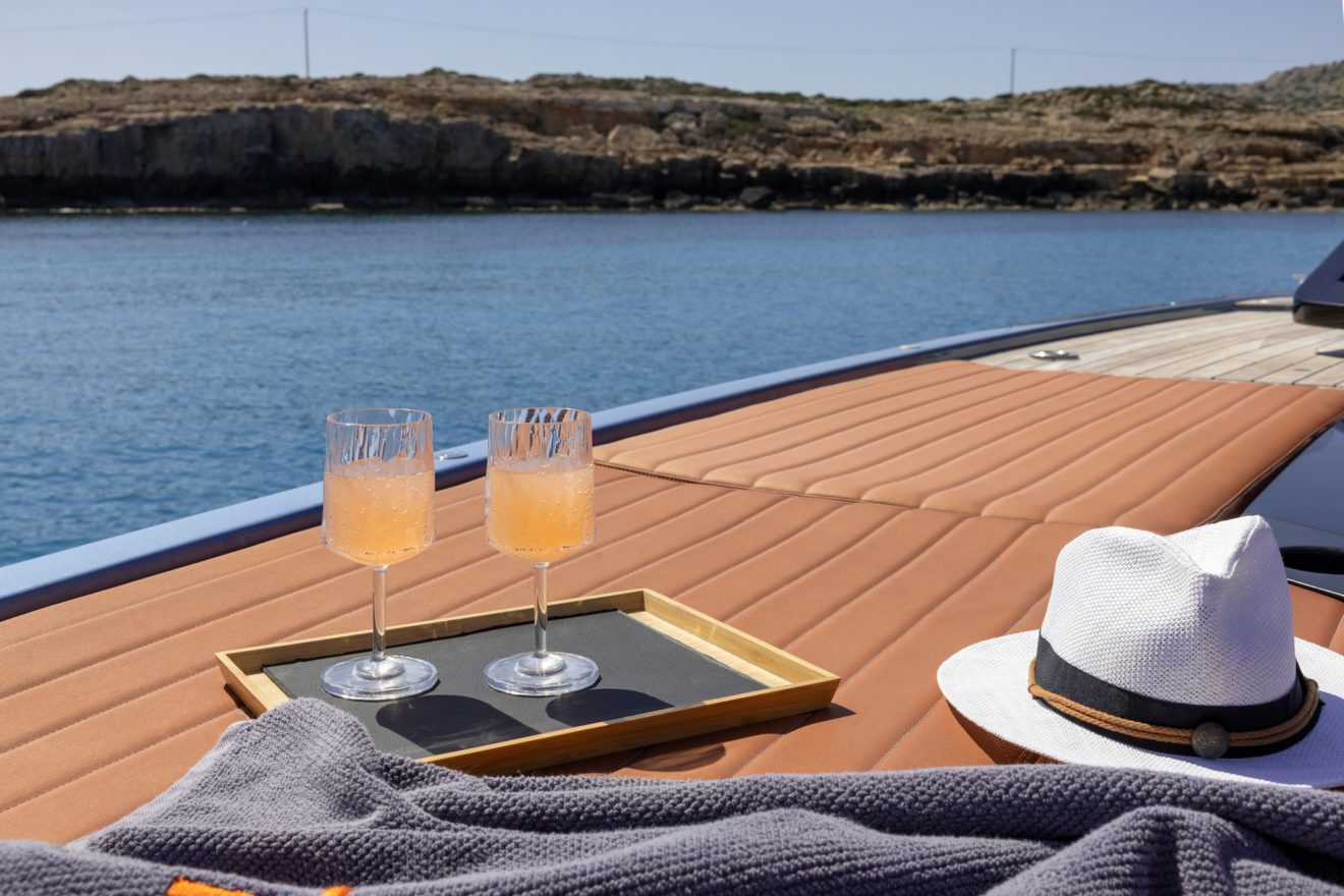M/Y AERRO offers a thoughtfully arranged layout that balances comfort with functionality. The interior saloon features a generous double sofa dinette, providing a comfortable setting for dining or relaxing in a refined, climate-controlled space. Below deck, the guest cabin benefits from its own private head, while a separate day head serves visitors. Outside, the aft sunbed creates an inviting lounging area, and the signature lateral hydraulic terraces deploy at anchor to extend the deck and enhance enjoyment of the surroundings.