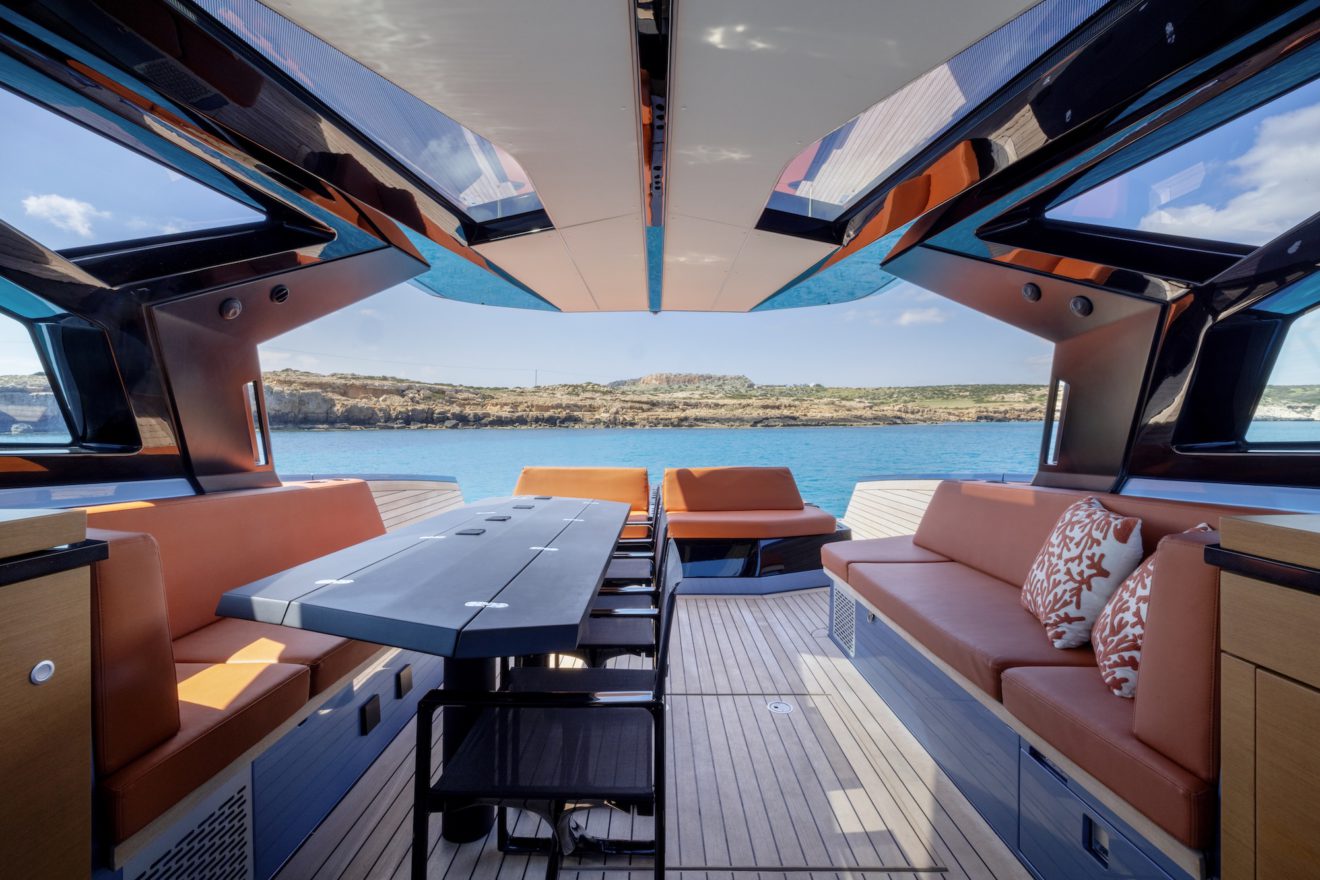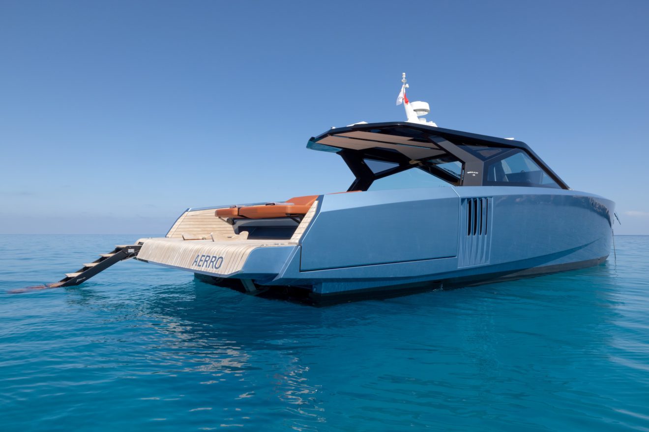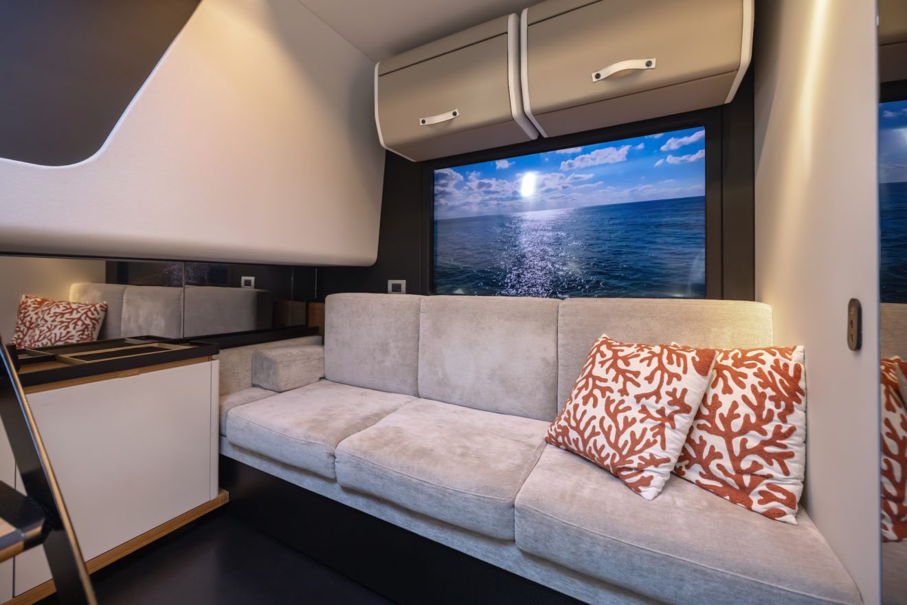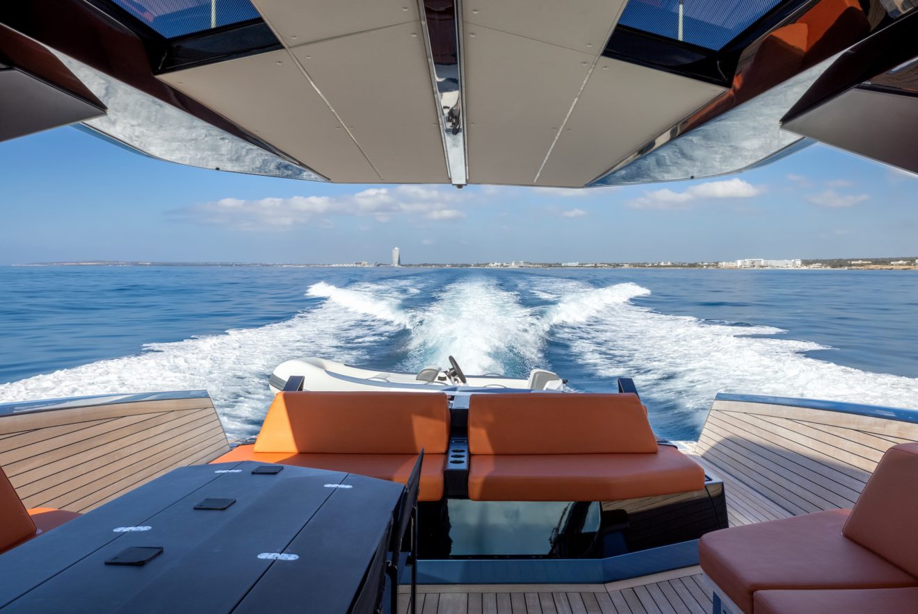 M/Y AERRO offers a thoughtfully arranged layout that balances comfort with functionality. The interior saloon features a generous double sofa dinette, providing a comfortable setting for dining or relaxing in a refined, climate-controlled space. Below deck, the guest cabin benefits from its own private head, while a separate day head serves visitors. Outside, the aft sunbed creates an inviting lounging area, and the signature lateral hydraulic terraces deploy at anchor to extend the deck and enhance enjoyment of the surroundings.