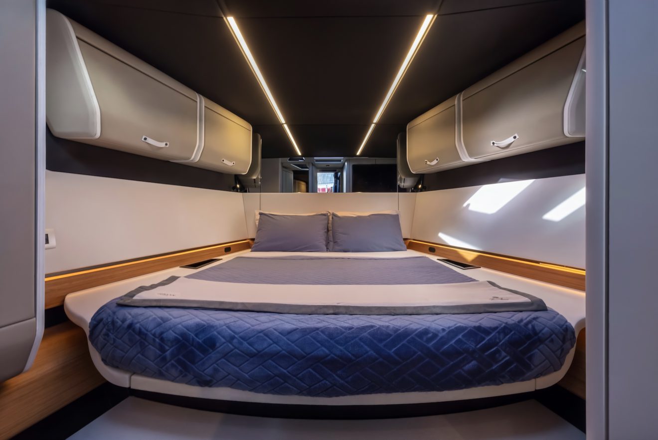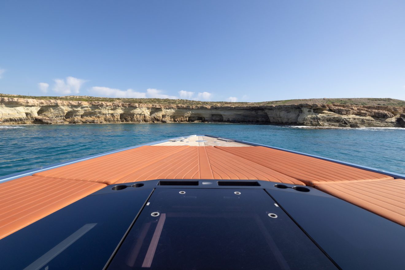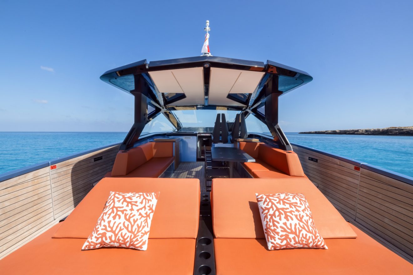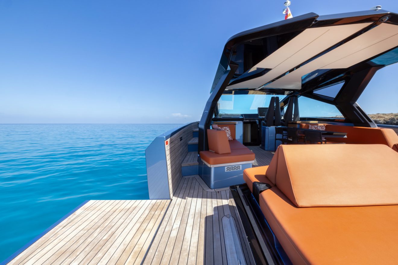 M/Y AERRO offers a thoughtfully arranged layout that balances comfort with functionality. The interior saloon features a generous double sofa dinette, providing a comfortable setting for dining or relaxing in a refined, climate-controlled space. Below deck, the guest cabin benefits from its own private head, while a separate day head serves visitors. Outside, the aft sunbed creates an inviting lounging area, and the signature lateral hydraulic terraces deploy at anchor to extend the deck and enhance enjoyment of the surroundings.
