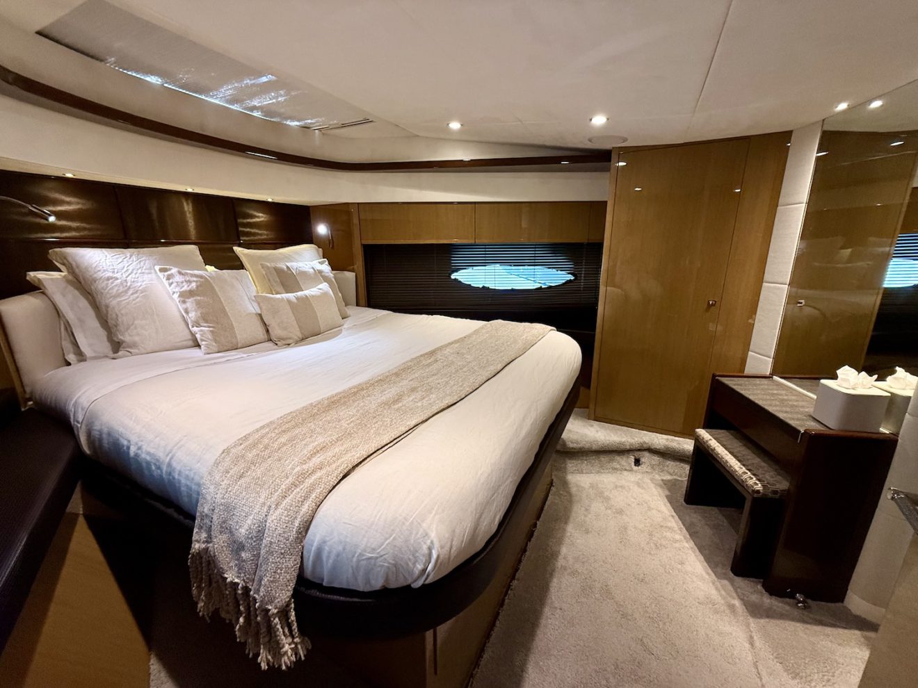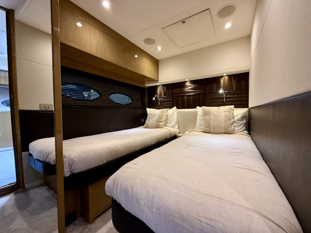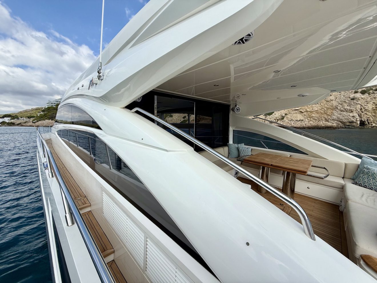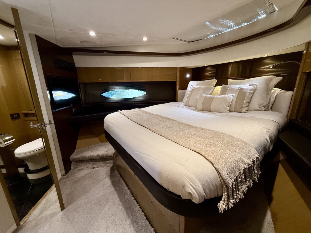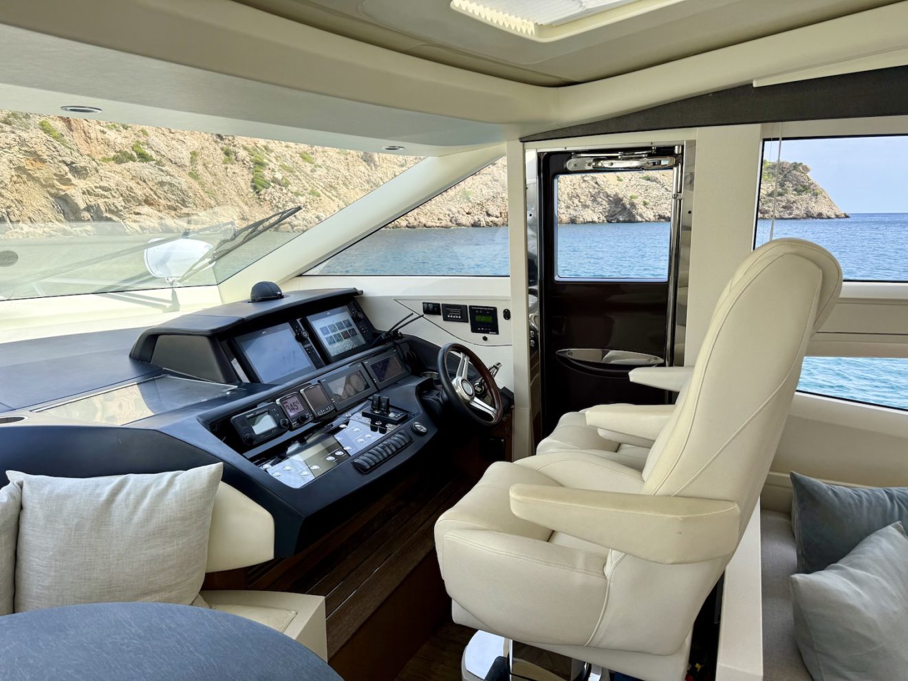 M/Y BLISS, a 2015 Princess V72 launched in 2016, perfectly blends performance, comfort, and style. Maintained year-round by a professional captain and recently refitted, she is presented in outstanding condition. Her sleek, sporty lines frame generous exterior spaces, including a sunbathing foredeck, an alfresco aft cockpit, and a hydraulic bathing platform for easy sea access. The retractable-roof saloon opens to the elements, creating a bright, versatile social area connected to the fully equipped galley and helm. Below deck, three luxurious ensuite cabins—including a full- beam master suite—offer refined comfort and privacy, making BLISS an exceptional cruising yacht.