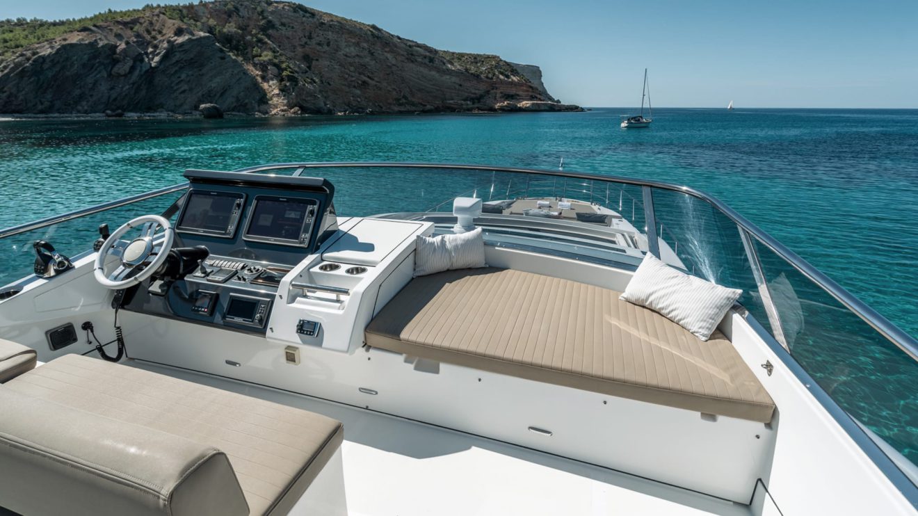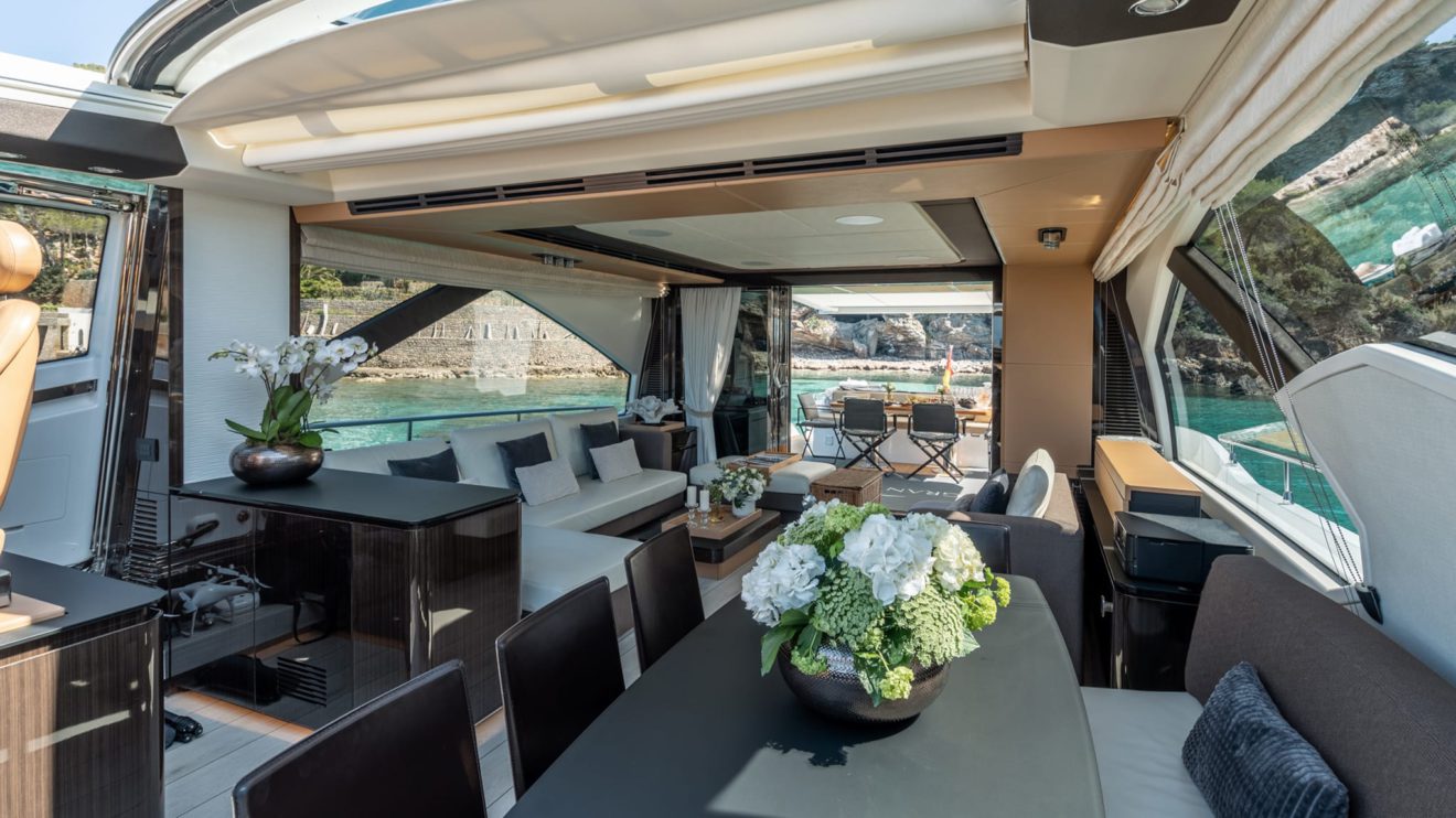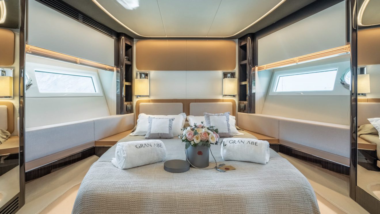 M/Y GRAN ABE II features a dynamic yet practical layout that maximizes both indoor and outdoor living. The exterior offers expansive sunbathing areas forward and aft, along with a beach club-style stern that creates a seamless connection to the sea. The cockpit flows naturally into the main salon, where large panoramic windows fill the contemporary interior with natural light. The salon connects to a well-appointed dining area and galley, designed for comfort and functionality. Below deck, the intelligently arranged accommodations host up to nine guests across well-proportioned cabins, delivering privacy, versatility and refined onboard living throughout.