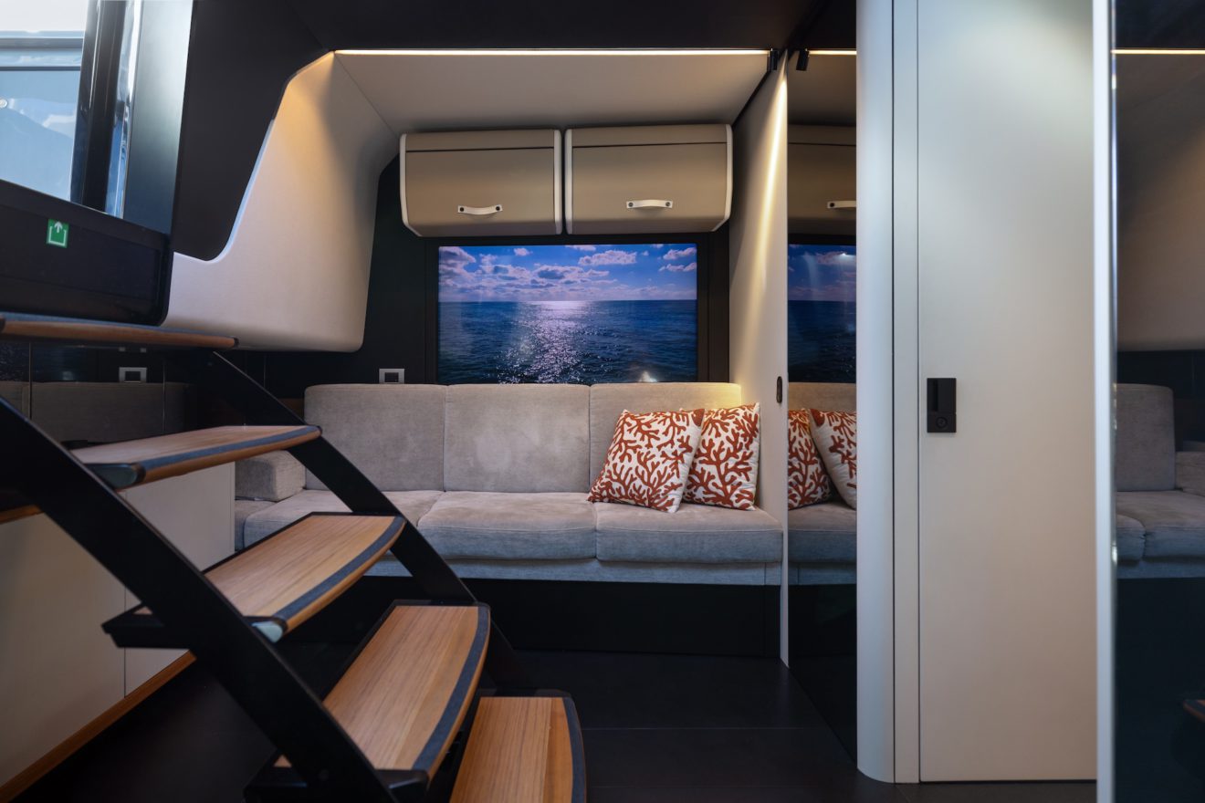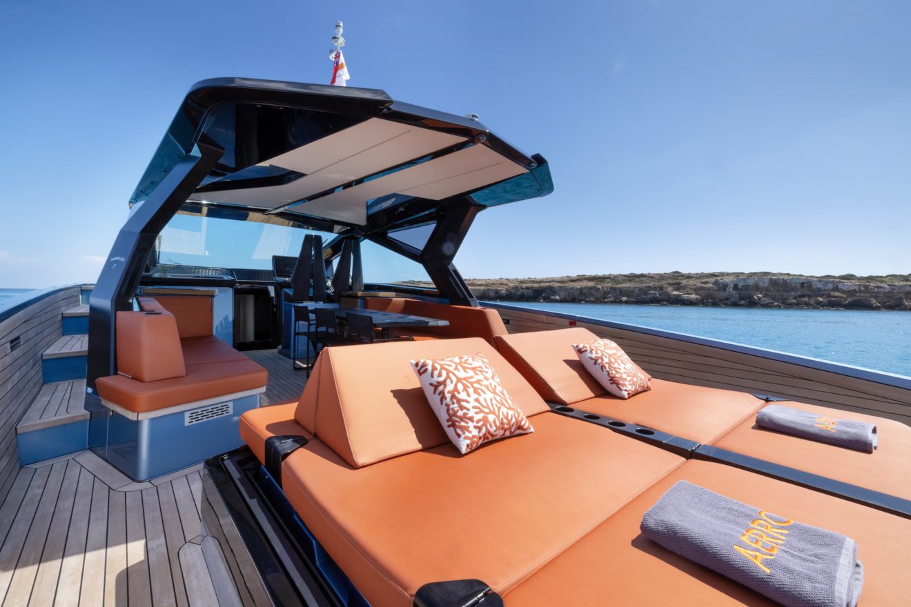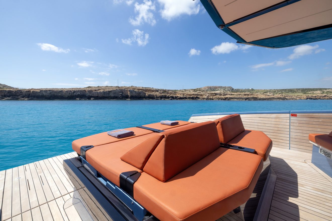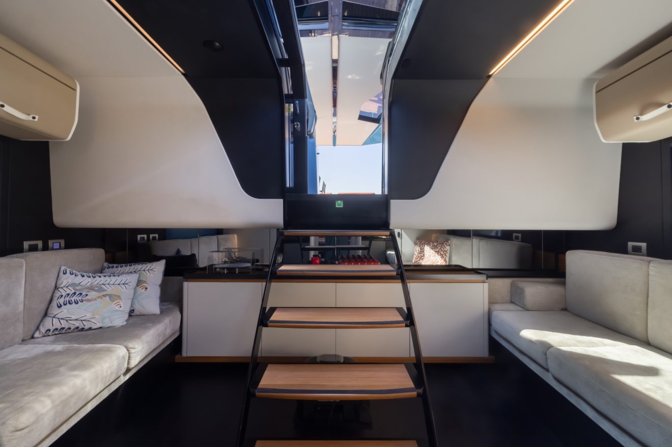 M/Y AERRO offers a thoughtfully arranged layout that balances comfort with functionality. The interior saloon features a generous double sofa dinette, providing a comfortable setting for dining or relaxing in a refined, climate-controlled space. Below deck, the guest cabin benefits from its own private head, while a separate day head serves visitors. Outside, the aft sunbed creates an inviting lounging area, and the signature lateral hydraulic terraces deploy at anchor to extend the deck and enhance enjoyment of the surroundings.