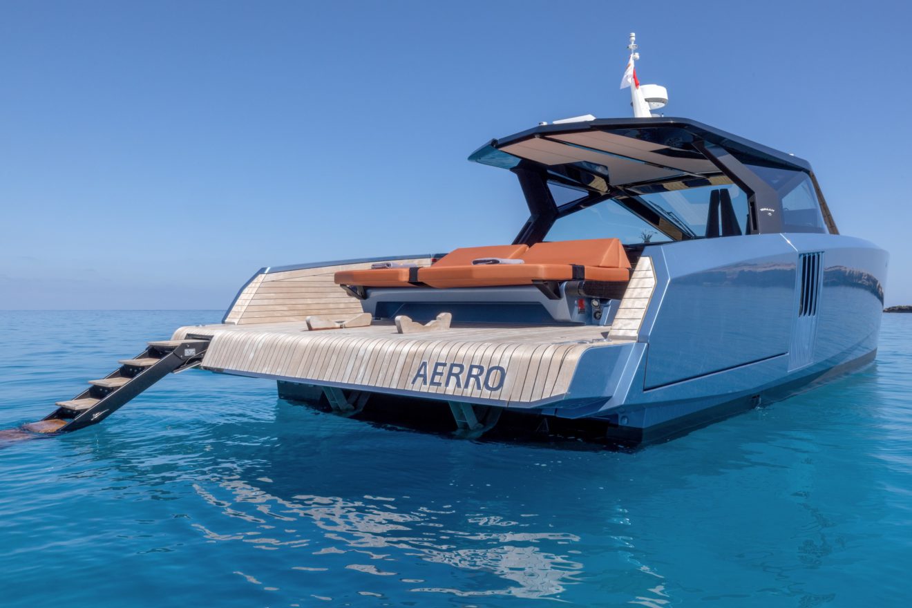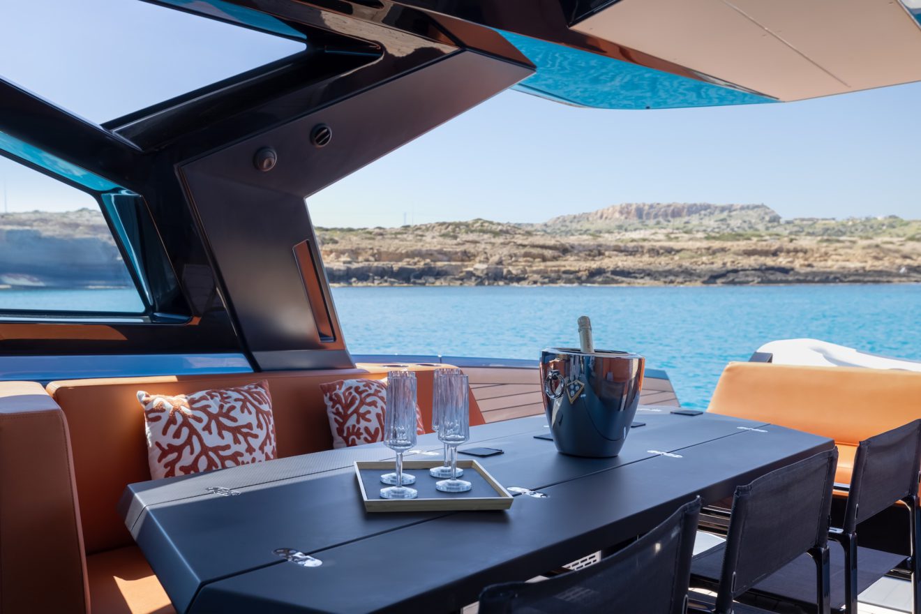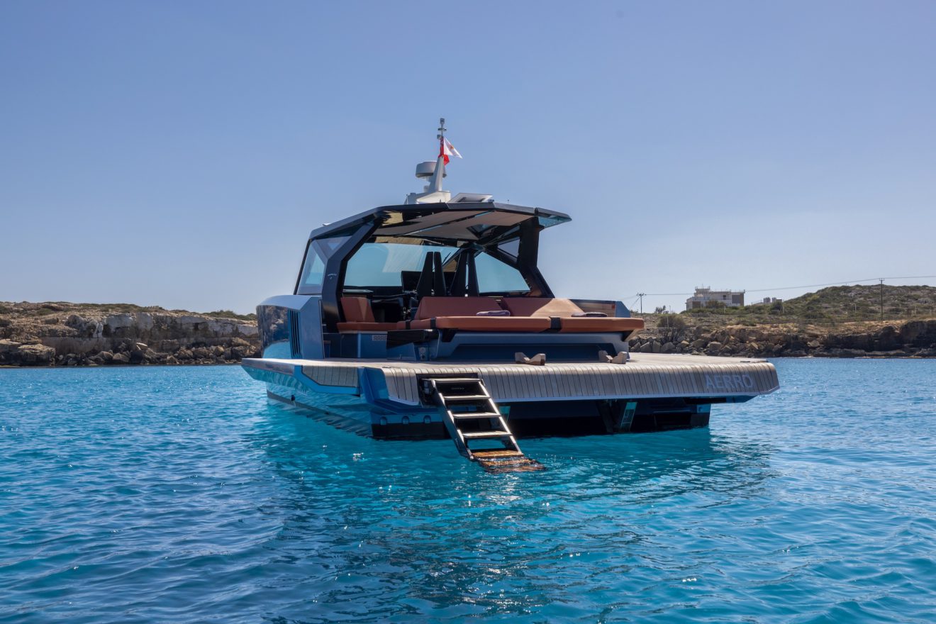 M/Y AERRO offers a thoughtfully arranged layout that balances comfort with functionality. The interior saloon features a generous double sofa dinette, providing a comfortable setting for dining or relaxing in a refined, climate-controlled space. Below deck, the guest cabin benefits from its own private head, while a separate day head serves visitors. Outside, the aft sunbed creates an inviting lounging area, and the signature lateral hydraulic terraces deploy at anchor to extend the deck and enhance enjoyment of the surroundings.