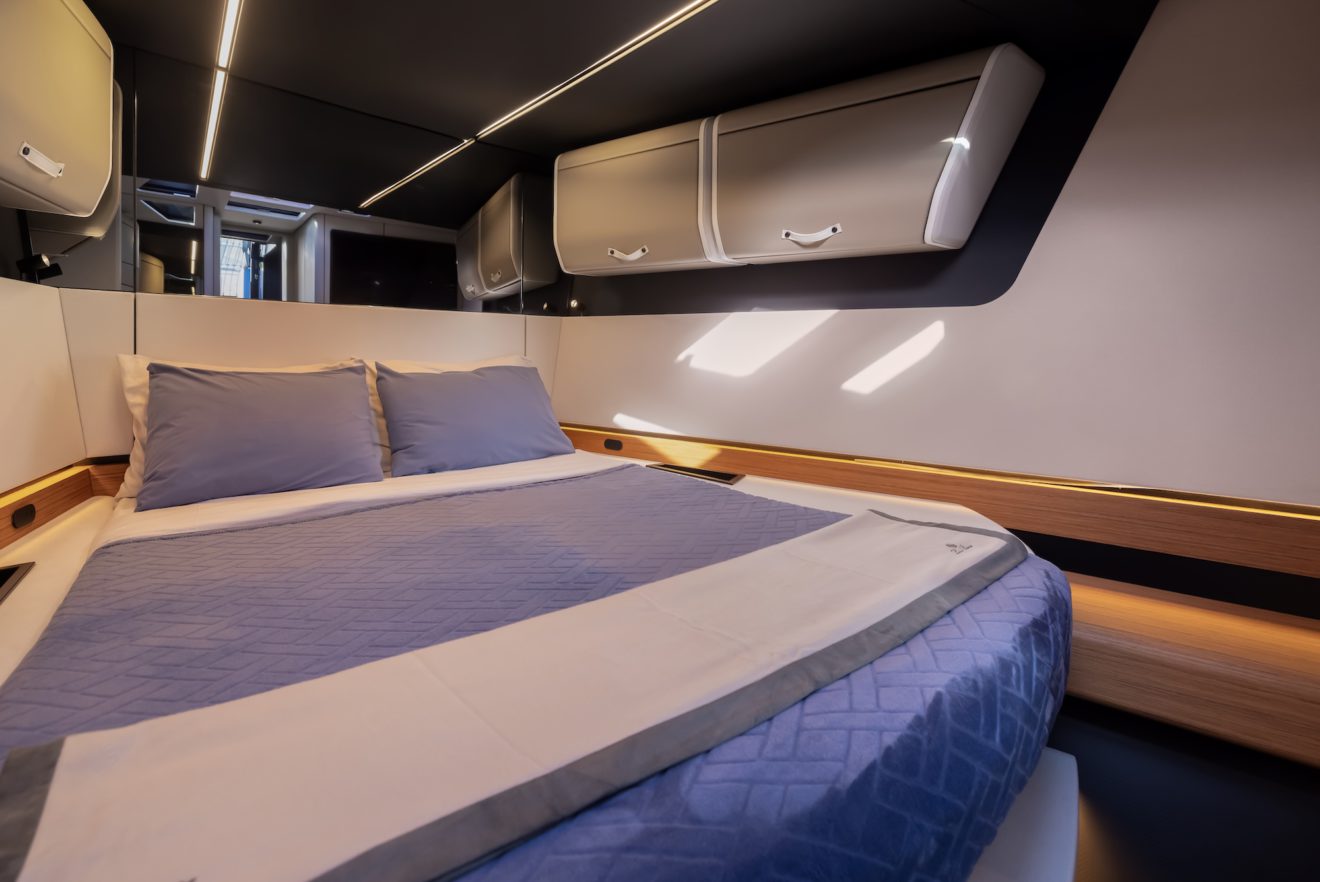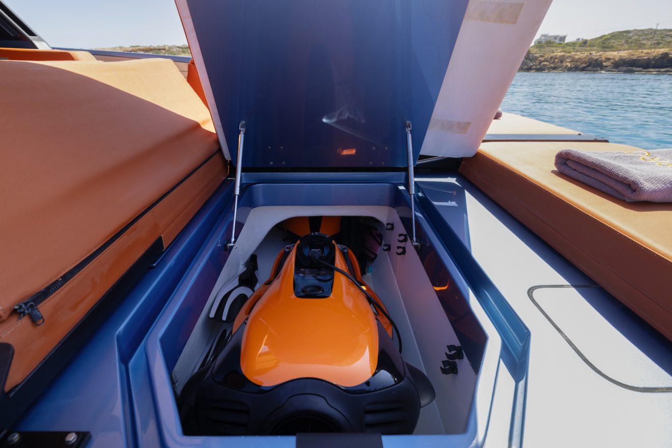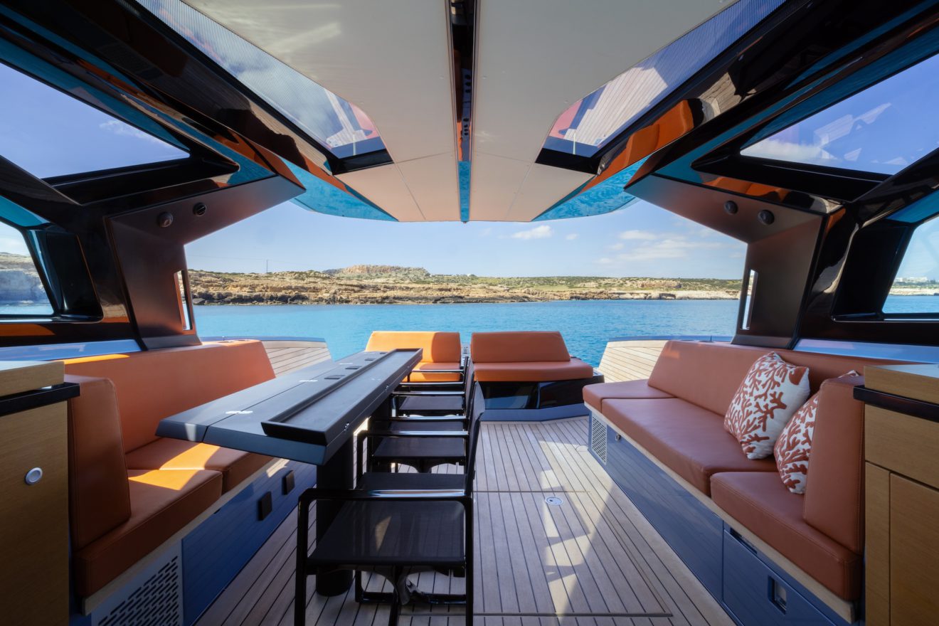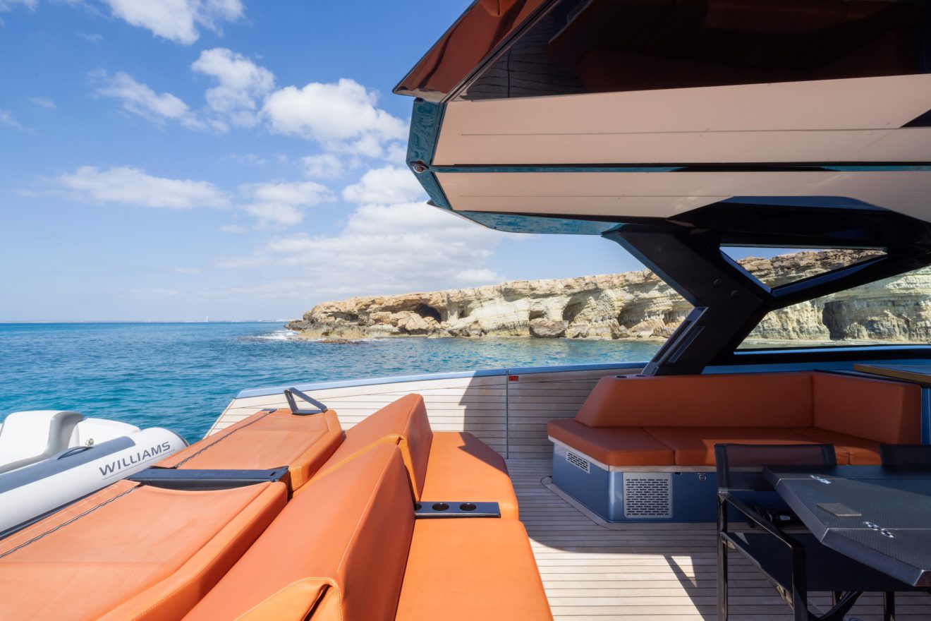 M/Y AERRO offers a thoughtfully arranged layout that balances comfort with functionality. The interior saloon features a generous double sofa dinette, providing a comfortable setting for dining or relaxing in a refined, climate-controlled space. Below deck, the guest cabin benefits from its own private head, while a separate day head serves visitors. Outside, the aft sunbed creates an inviting lounging area, and the signature lateral hydraulic terraces deploy at anchor to extend the deck and enhance enjoyment of the surroundings.