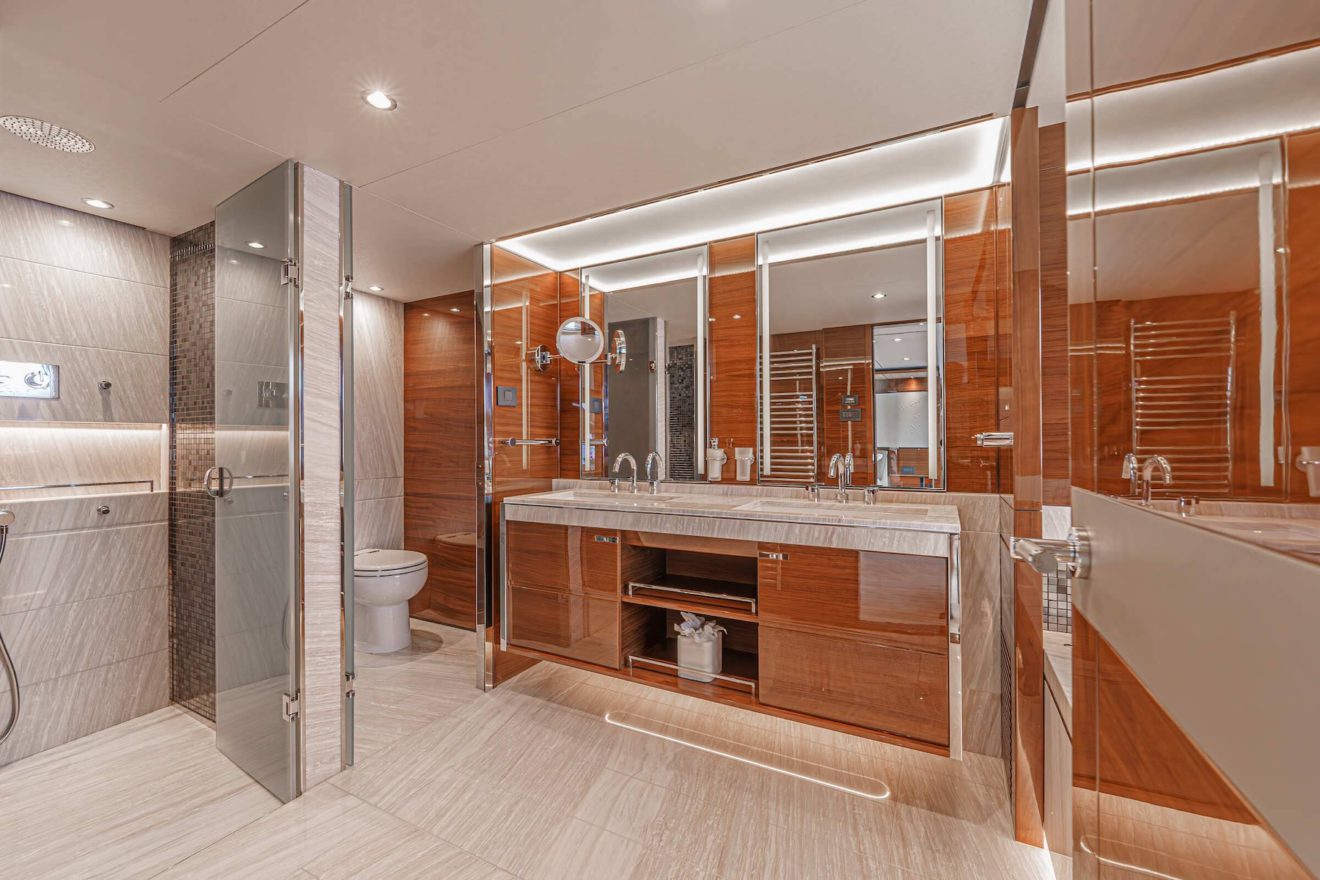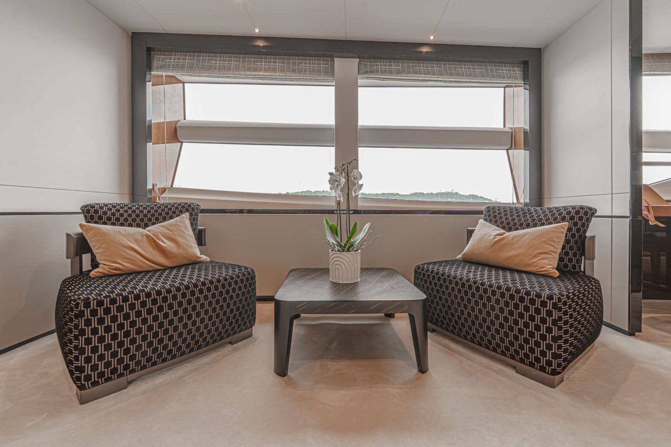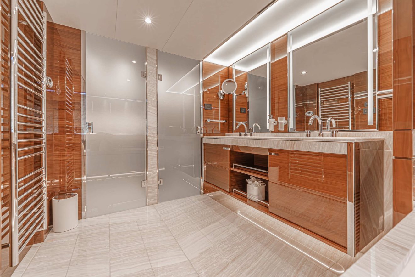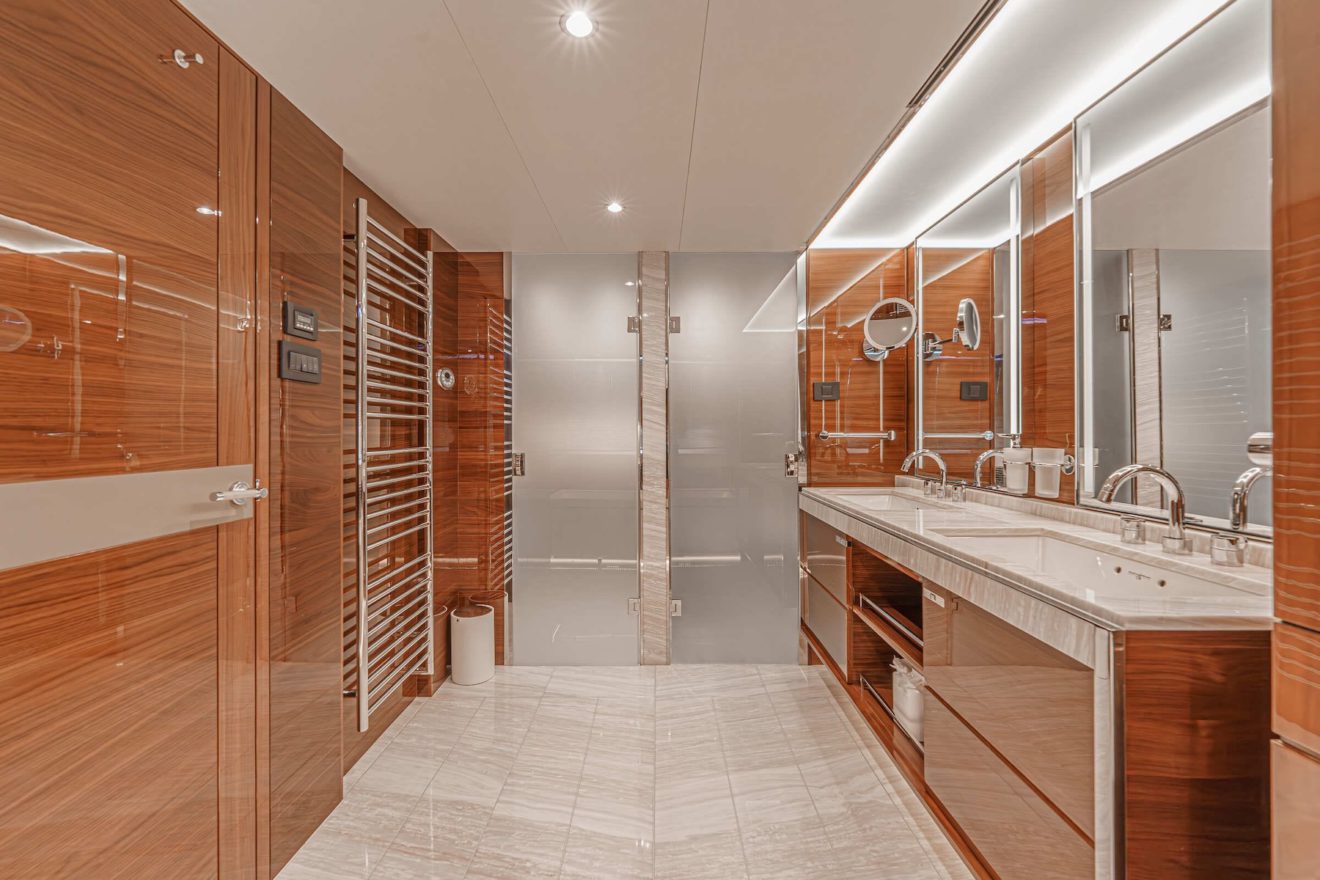 The layout of AVALON is designed to offer both privacy and functionality across all decks. The main deck features a bright saloon with lounge and dining areas, alongside a well-appointed galley. Forward, the full-beam owner’s suite benefits from generous space, including walk-in wardrobes, a study area and a large en-suite bathroom. On the lower deck, a second full-beam cabin amidships provides exceptional comfort, complemented by two additional guest cabins. Outdoor spaces are equally well arranged, with a spacious flybridge for socialising, a comfortable cockpit and a practical swim platform with tender garage, ensuring seamless enjoyment on board.