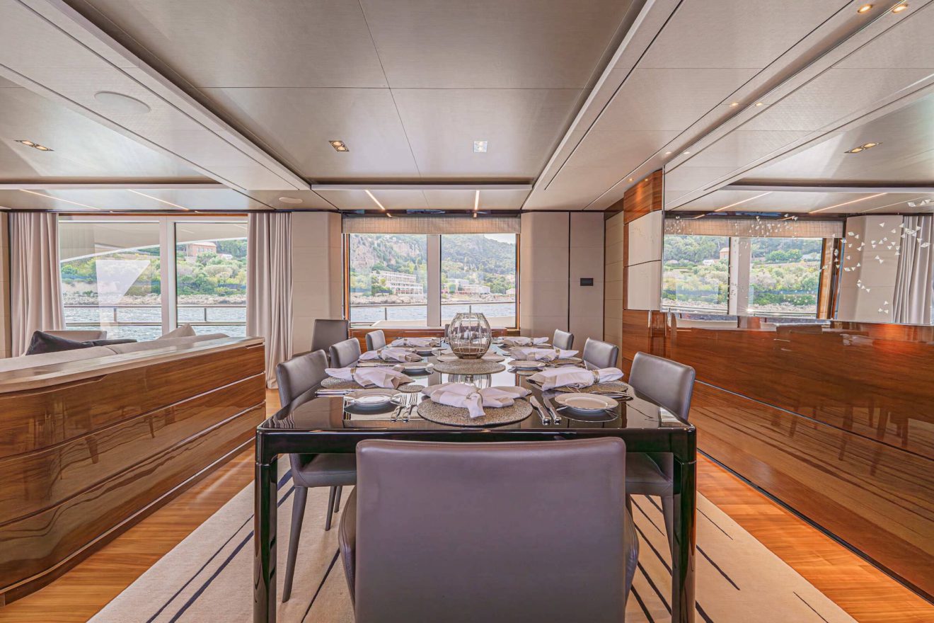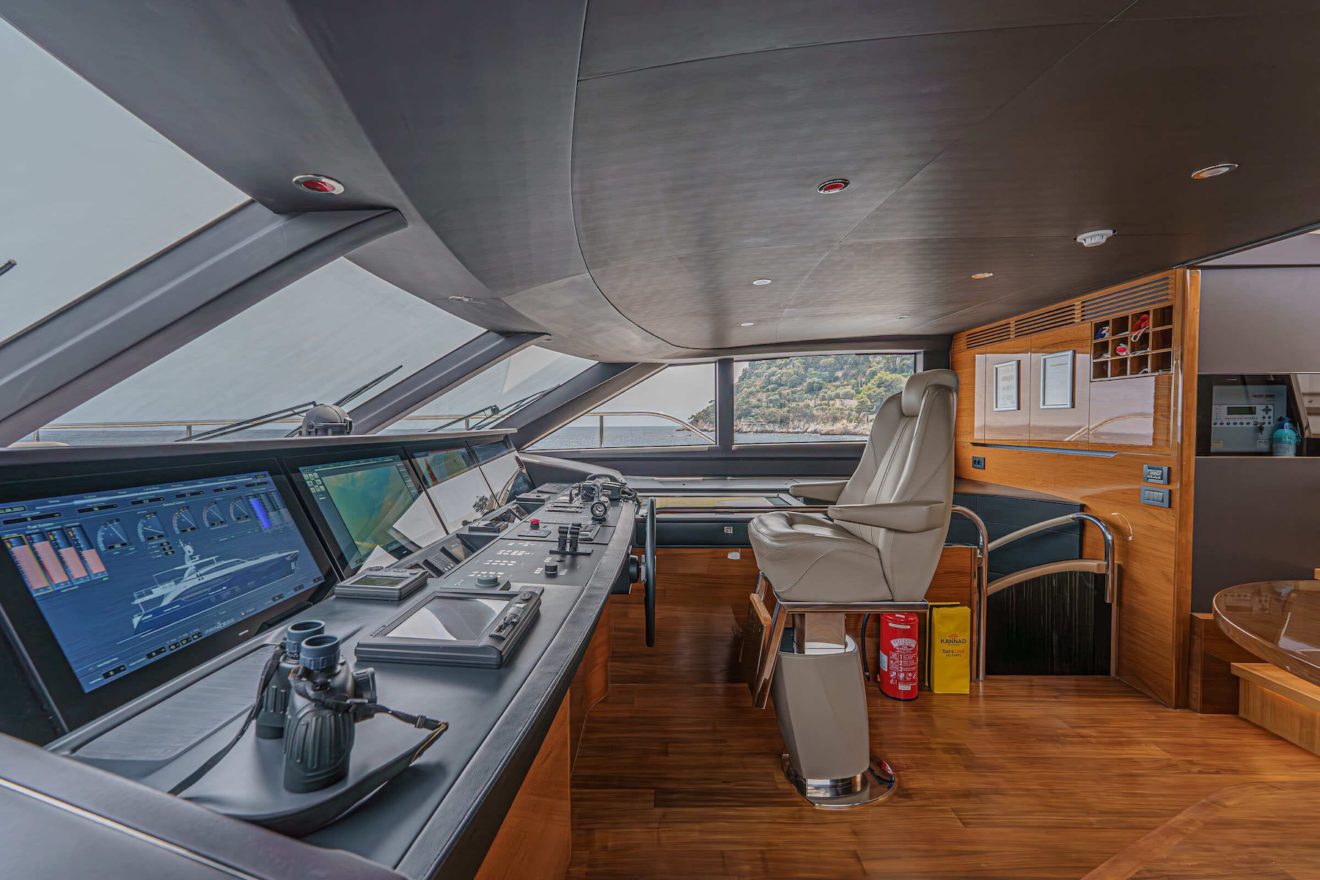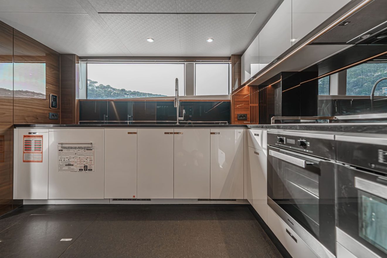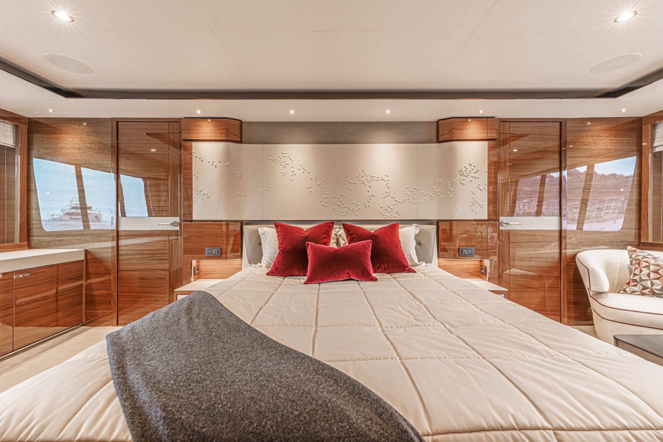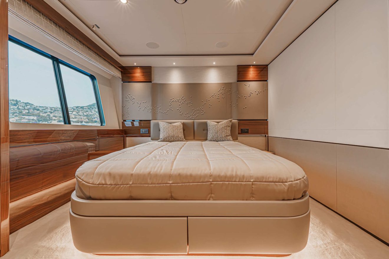 The layout of AVALON is designed to offer both privacy and functionality across all decks. The main deck features a bright saloon with lounge and dining areas, alongside a well-appointed galley. Forward, the full-beam owner’s suite benefits from generous space, including walk-in wardrobes, a study area and a large en-suite bathroom. On the lower deck, a second full-beam cabin amidships provides exceptional comfort, complemented by two additional guest cabins. Outdoor spaces are equally well arranged, with a spacious flybridge for socialising, a comfortable cockpit and a practical swim platform with tender garage, ensuring seamless enjoyment on board.