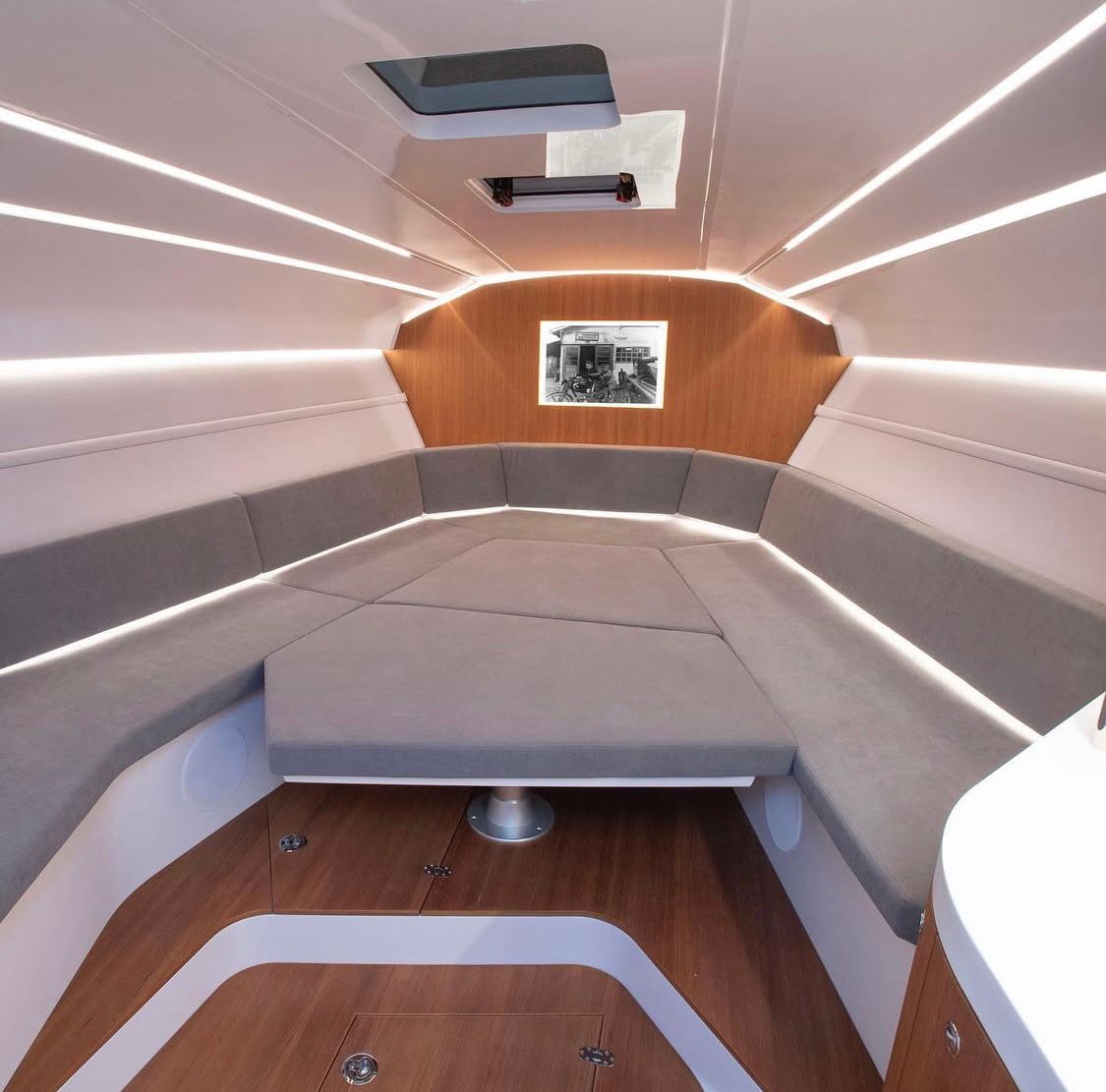 An extraordinary 46 foot offshorer that completes the unique Frauscher design with a perfect living space for a weekend trip. The 1414 Demon combines the key Frauscher design DNA: flat bow with vertical stem, tinted and frameless windshield, air inlets in carbon. The 1414 Demon provides lots of living space: a relaxing lounge atmosphere with a large bathing platform, a well garnished outdoor galley, a uniquely designed interior with enough headroom, a spacious bathroom, a kitchenette, a large sitting area and a sleeping accommodation up to four people. EXCLUSIVE OPPORTUNITY YACHT FOR SALE WITH TRANSFERABLE BERTH IN PORT ADRIANO IN MALLORCA